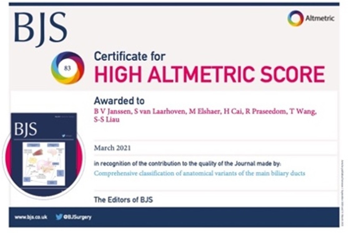 Mr Liau’s seminal work on biliary anatomy, published in the British Journal of Surgery 2021, represents a significant advancement in the understanding of intrahepatic biliary variations. As a senior author, Mr. Liau led a comprehensive systematic review and meta-analysis that synthesised data from 35 studies encompassing over 11,700 patients. This extensive analysis culminated in the development of a novel, prevalence-based classification system for intrahepatic biliary duct variants. Mr. Liau’s contribution provides a critical resource for surgeons, enhancing preoperative planning and intraoperative decision-making. By offering a standardised framework for identifying and categorising biliary anatomy, this work aids in reducing the risk of bile duct injuries and improving patient outcomes in hepatobiliary surgery. The significance of this research was further highlighted by its feature on the cover of the British Journal of Surgery, emphasizing its impact on surgical practice and education.
