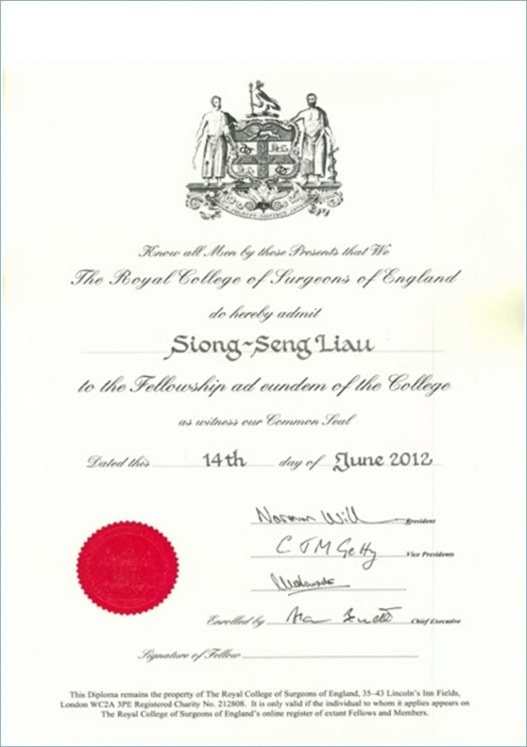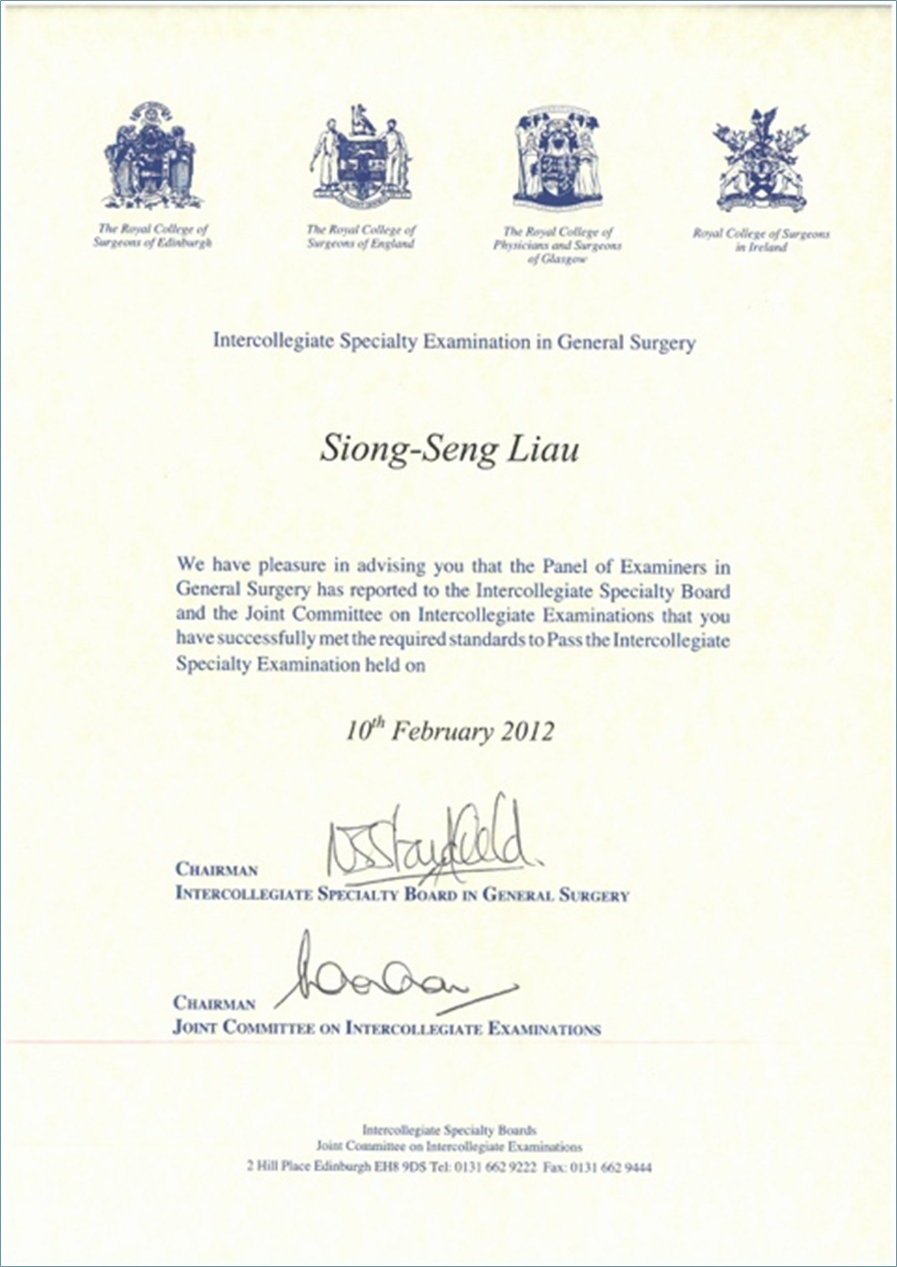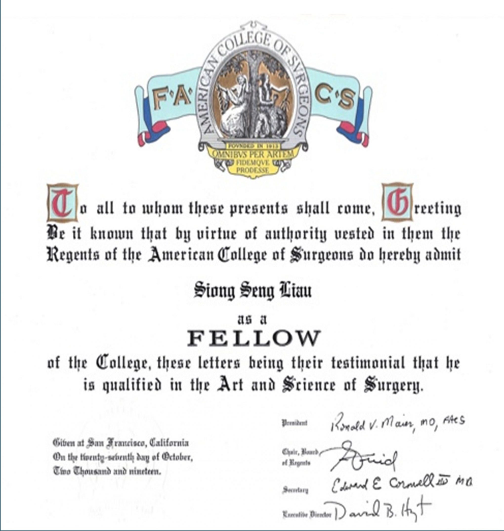 Throughout his career, Mr Liau has remained committed to surgical education and mentorship. He has supervised research fellows, acted as an examiner for MRCS and FRCS examinations in UK and overseas. He serves as examiner for Joint Specialty Fellowship examinations in General Surgery in Hong Kong and Singapore.
