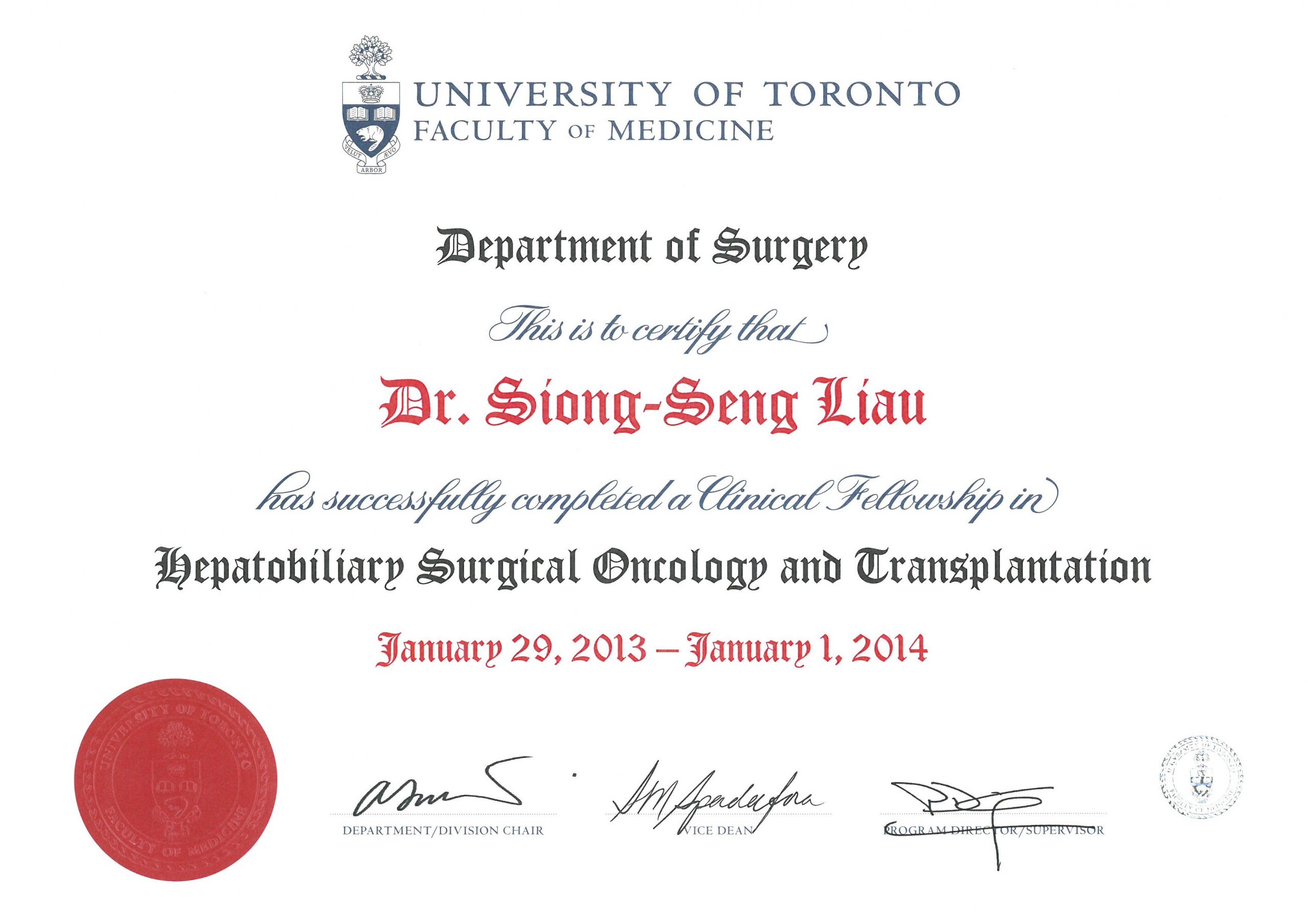 To deepen his expertise, Mr Liau then completed a prestigious post-CCT fellowship in HPB Surgical Oncology and Multi-organ Transplantation at Toronto General Hospital, one of North America’s premier centres for complex HPB surgery and transplantation where he performed over 200 complex HPB resections and gained advanced experience in liver and pancreas transplantation. He trained under Professors Paul Greig and Steven Gallinger, acquiring not only technical mastery but also insights into multidisciplinary cancer care and research. This fellowship was supported by the Ellion-Cliffe Travelling Fellowship from the Royal Society of Medicine and University of Cambridge Parke Davis Fellowship.